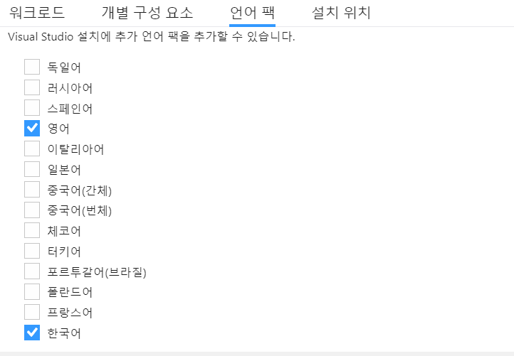 다음과 같은 오류가 생길 경우에는 Visual Studio에 영어가 없어서 생기는 문제이다.